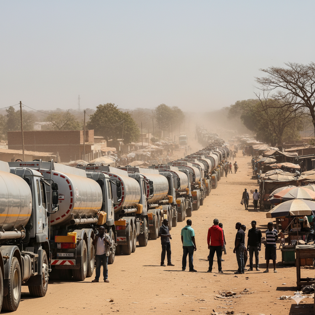 “A line of fuel tankers stretches into the distance on a dry, unpaved road in Africa, underscoring the wait for supply. Source: Sources Media .”